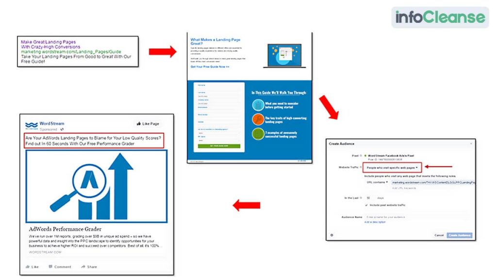 In the image, Tom Brady is AdWords while Randy moss is Facebook. A prospect will see and click on the text ad and eventually downloads the whitepaper. Next, another audience on Facebook composed exclusively of people that downloaded the whitepaper gets served with a hyper-specific ad (Facebook).